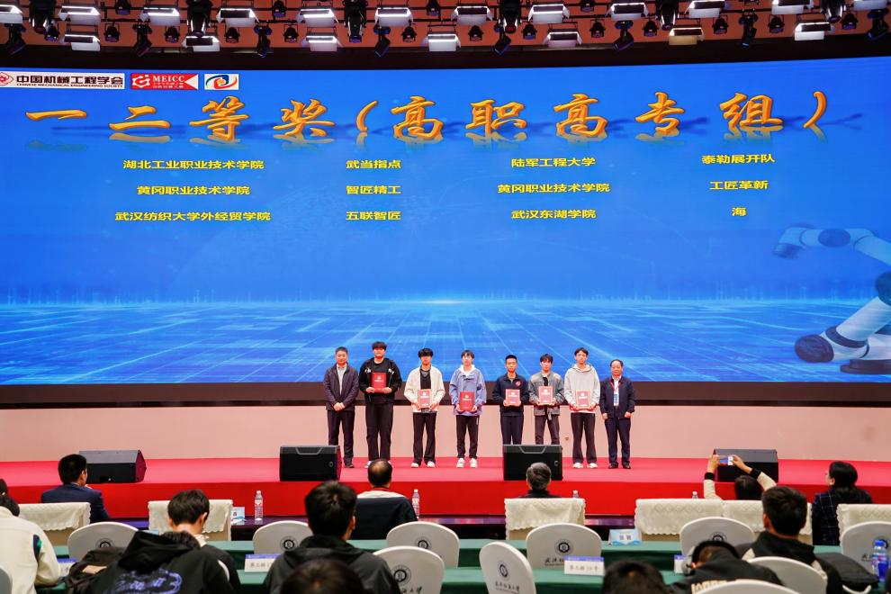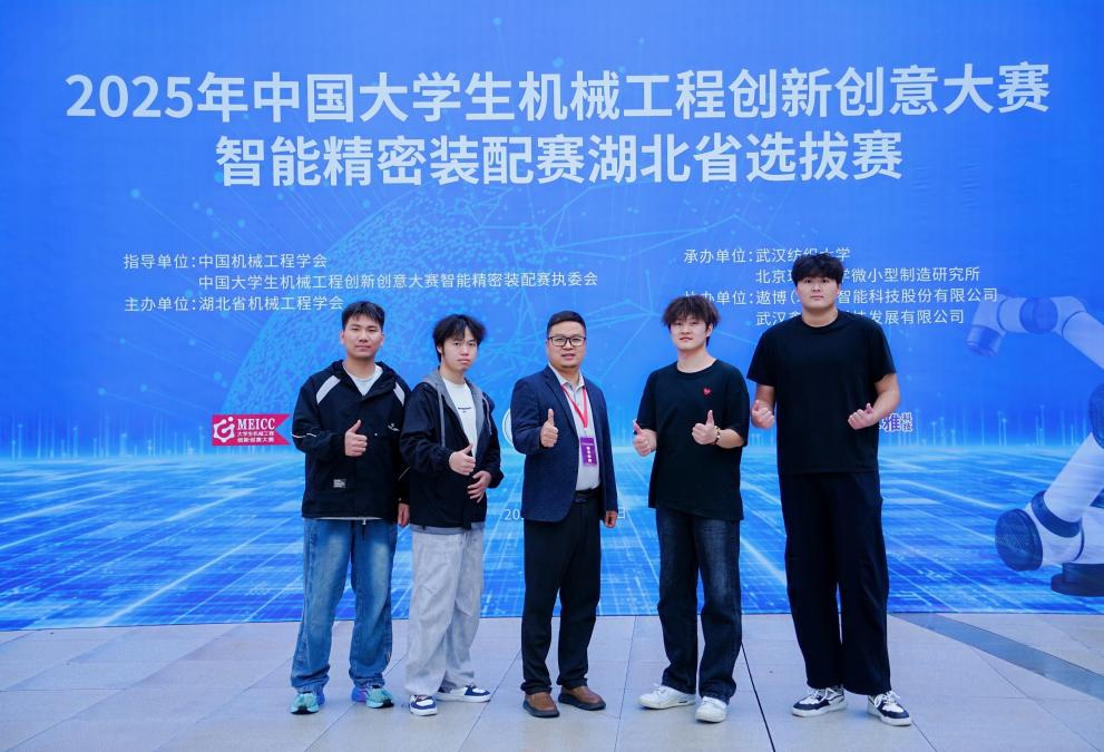 近日,2025年中国大学生机械工程创新创意大赛智能精密装配赛湖北省选拔赛在武汉纺织大学落幕。由我校机电工程学院肖德华、陶华伟老师指导,工业机器人技术专业朱瀚林等4 名同学组成的团队,在全省57所高校近百支队伍角逐中脱颖而出,获高职高专组省级一等奖,并获全国总决赛推荐资格。