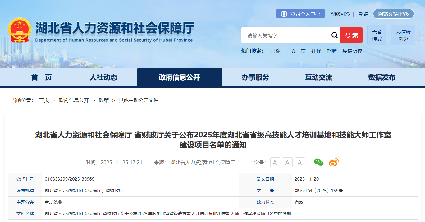 近日,湖北省人力资源与社会保障厅、省财政厅公布了“2025年湖北省省级高技能人才培训基地和技能大师工作室建设项目名单”,我校首次获批省级高技能人才培训基地,建设方向工业机器人技术、无人机应用技术、机械制造及自动化,同时,机电工程学院教师潘强领办的“多工序数控机床操作调整工技能大师工作室”获批省级技能大师工作室。