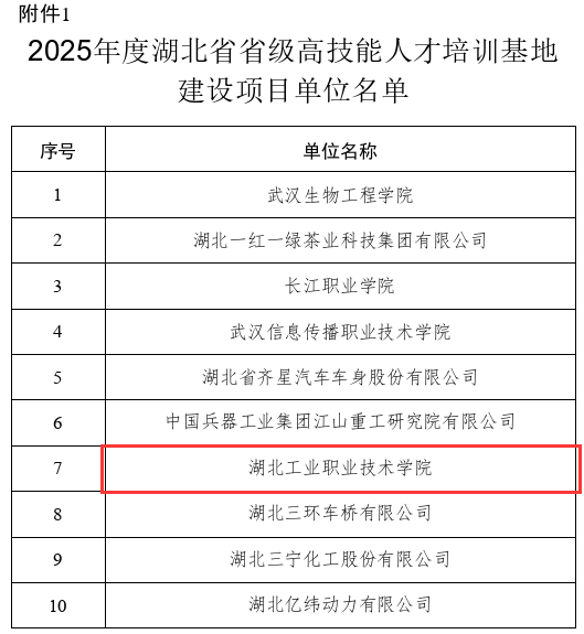 此次全省共评选出了高技能人才培训基地10家单位、技能大师工作室20家单位。我校两个项目同时入选,既是对学校过往办学实力与技能人才培养成果的肯定,更是开启高技能人才培养新篇章的全新起点。未来,学校将以省级高技能人才培训基地建设为抓手,聚焦 “培养高技能人才、服务地方产业发展” ,进一步整合优质教学资源,升级实训设施设备,创新技能培训课程体系,打造高标准的技能人才培育平台,充分发挥基地的示范辐射作用,输送更多 “懂技术、善操作、能创新” 的高素质高技能人才,为区域产业发展贡献 “湖工职力量”!