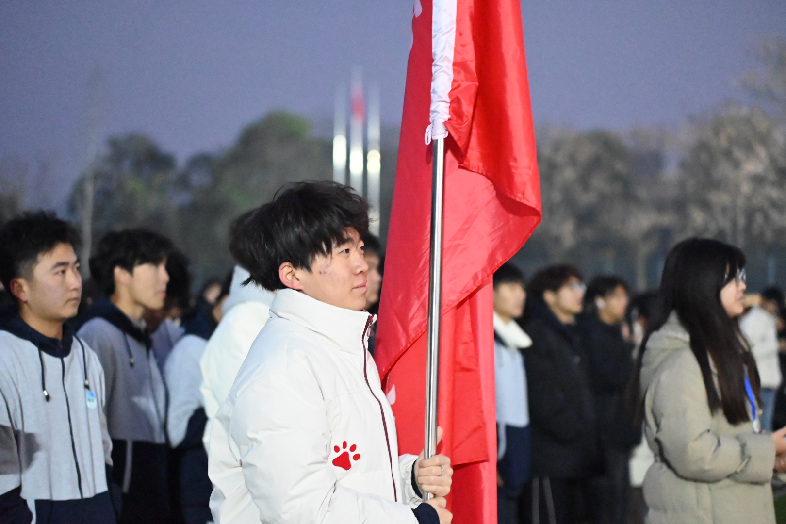 东方将白,机电工程学院全体师生肃穆立正,激昂的国歌萦绕耳畔,涤荡心间,一道道坚定的目光注视着五星红旗冉冉升起。眼神中流露出强烈的爱国情怀与集体荣誉感。